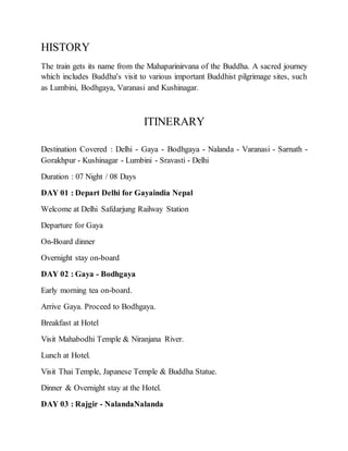 The Mahaparinirvan Express is a tourist train launched in 2007 to attract Buddhist pilgrims. It operates for 8 days and 7 nights, taking passengers on a spiritual tour of important Buddhist sites across Northern India, including Lumbini, Bodhgaya, Varanasi, and Kushinagar. Fares start at USD 115 for an AC third tier cabin and go up to USD 165 for an AC first class cabin. The train gets its name from Gautama Buddha's Mahaparinirvana, or final death, and follows in the places he visited.