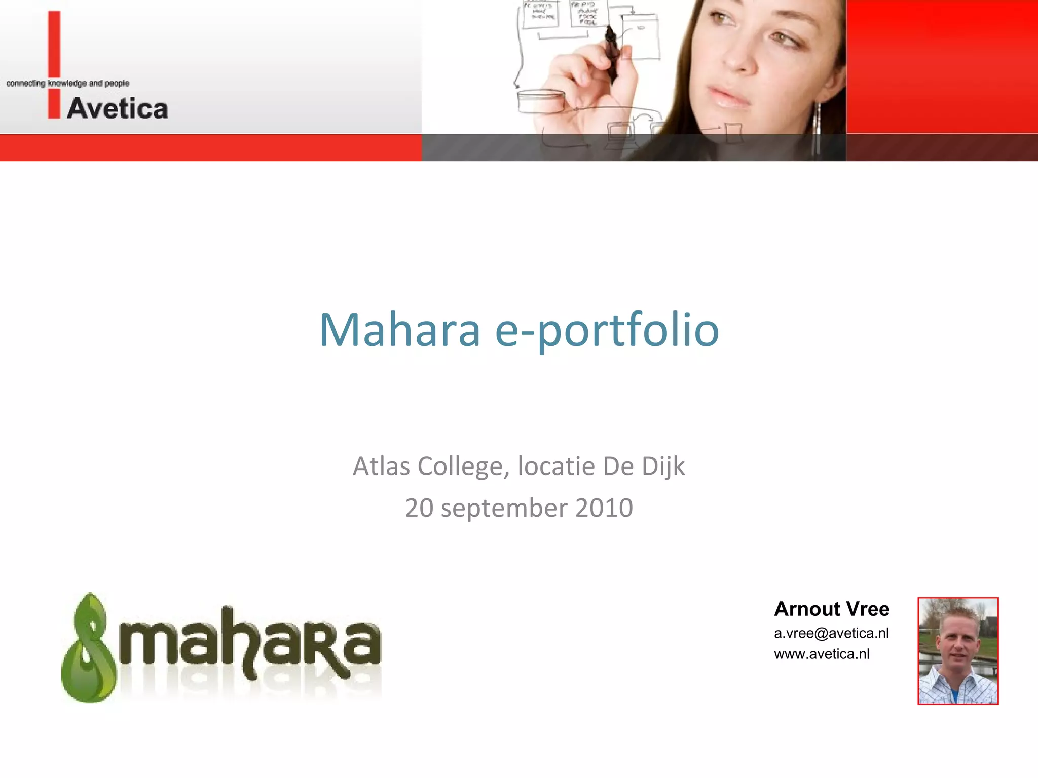 Mahara e-portfolio AtlasCollege, locatie De Dijk 20 september 2010 Arnout Vree a.vree@avetica.nl www.avetica.nl