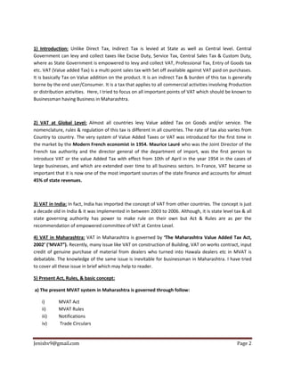 This document provides an overview of the Maharashtra Value Added Tax (MVAT) system. It discusses the introduction of VAT globally and in India, as well as an overview of MVAT in Maharashtra. The key aspects covered include the MVAT Act and rules, registration requirements, tax invoices, rates and classifications, input credit/set off rules, payment requirements, returns, and TDS requirements. Methods of calculating VAT liability for normal dealers and works contractors are also summarized.