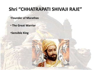 This document provides an overview of Maharashtra, India. It discusses the history of the Maratha empire and Peshwa dynasty. It highlights important figures in Maharashtra's history like Chhatrapati Shivaji and Dr. B. R. Ambedkar. It also summarizes the state's geography, politics, agriculture, culture and food. Important cities like Mumbai, Pune, Kolhapur and Aurangabad are mentioned for their historical sites. Mumbai is described as the commercial capital of India and for institutions like the dabbawalas lunch delivery system.