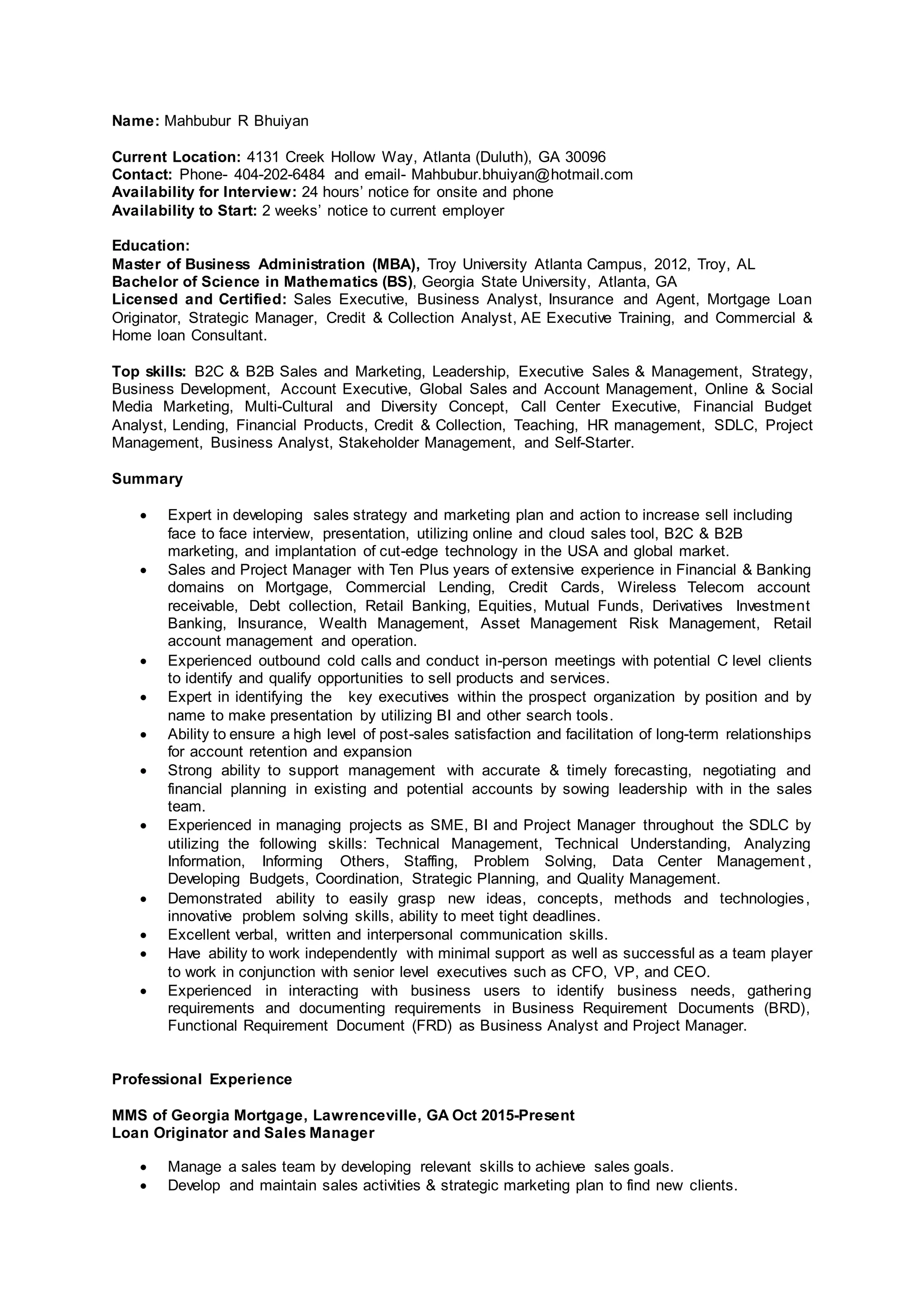 - Mahbubur R Bhuiyan is a business professional located in Atlanta, GA seeking a new opportunity. He has over 10 years of experience in sales, marketing, project management, and business analysis.