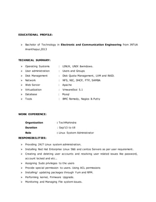 This document contains the resume of Mahesh D. He has over 3.5 years of experience as a Linux System Administrator. His responsibilities include installing and configuring Linux servers, managing users and permissions, performing backups, resolving issues, and monitoring system performance. He is proficient in technologies such as Apache, NFS, Samba, LVM, and VMware. Currently he works as a Linux System Administrator at TechMahindra, where he is responsible for providing 24/7 administration of Linux servers and virtual machines.