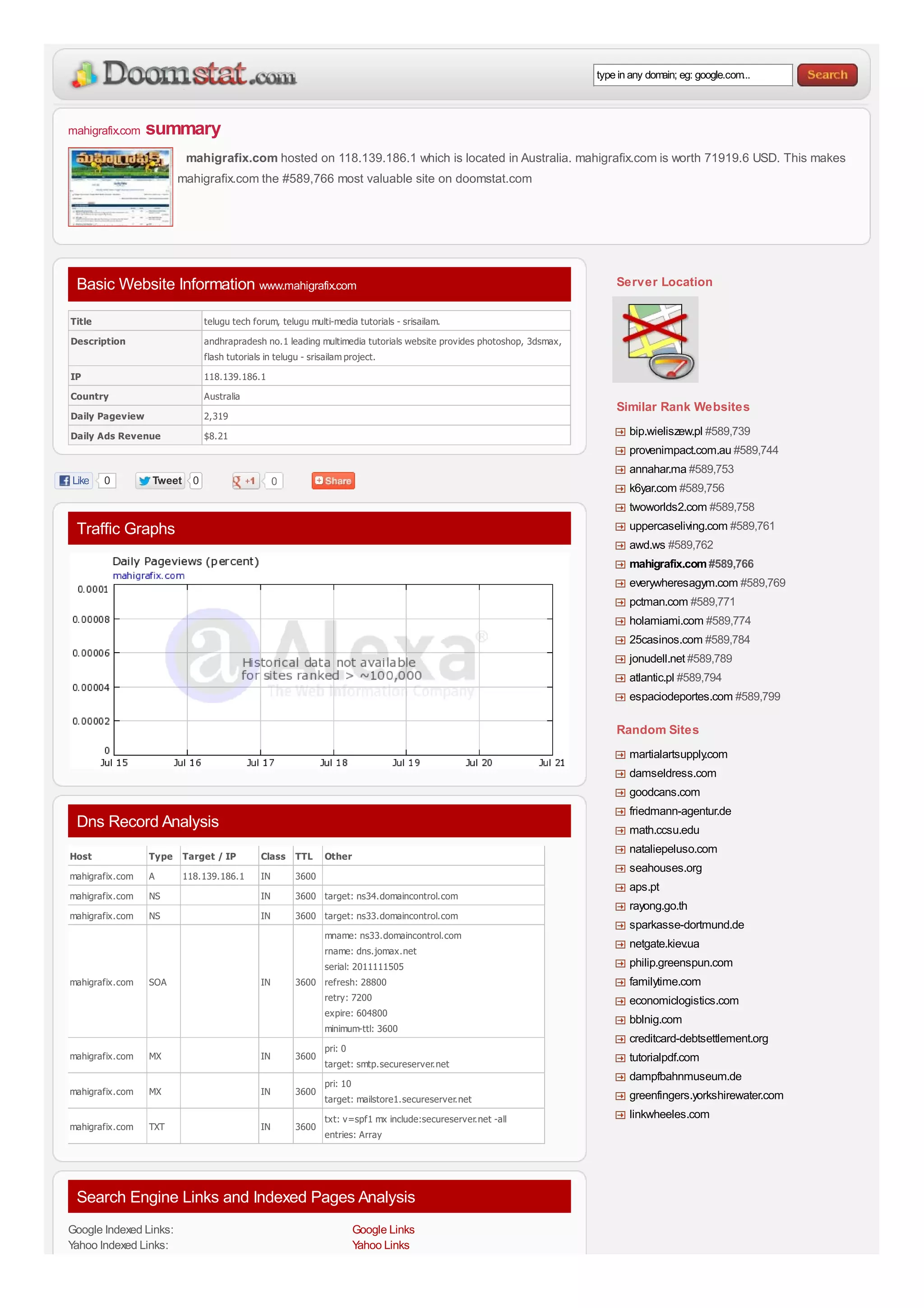 mahigrafix.com is a Telugu multimedia tutorials website hosted in Australia on the IP 118.139.186.1. It receives around 2,300 daily pageviews and $8 in daily ad revenue, making it the 589,766th most valuable site according to doomstat.com. The DNS records show it uses secureserver.net for email services and domaincontrol.com for name server services. Google and Yahoo have indexed some pages from the site but there are no search engine backlinks listed.
