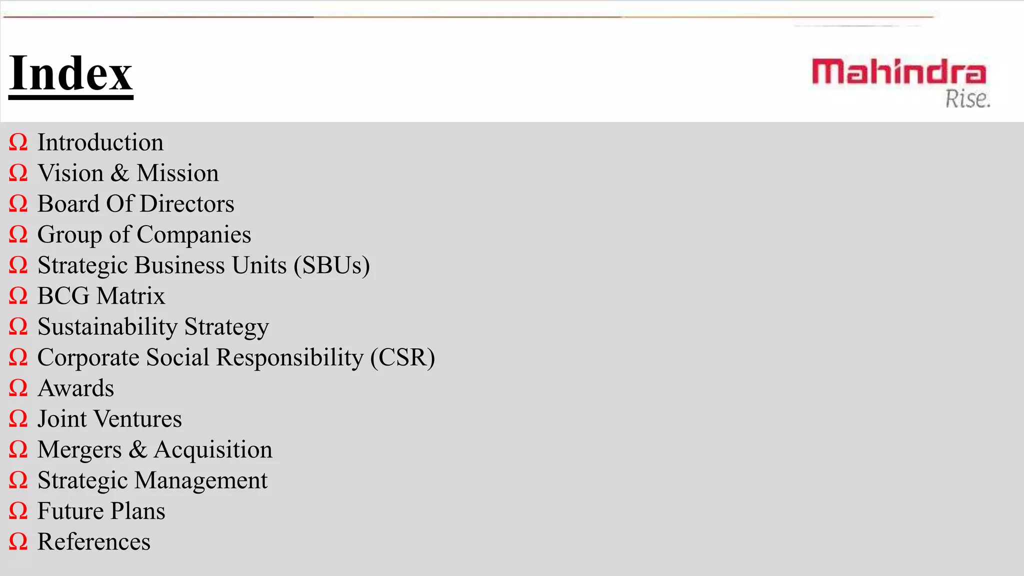 Mahindra & Mahindra is an Indian multinational conglomerate based in India. It operates in key industries such as automotive, farm equipment, defense, IT, and infrastructure development. It has diversified into 18 industries through 114 subsidiary companies. Some of its strategic business units include automotive, farm equipment, financial services, IT, and infrastructure development. It focuses on sustainability and corporate social responsibility through various environmental and social initiatives.