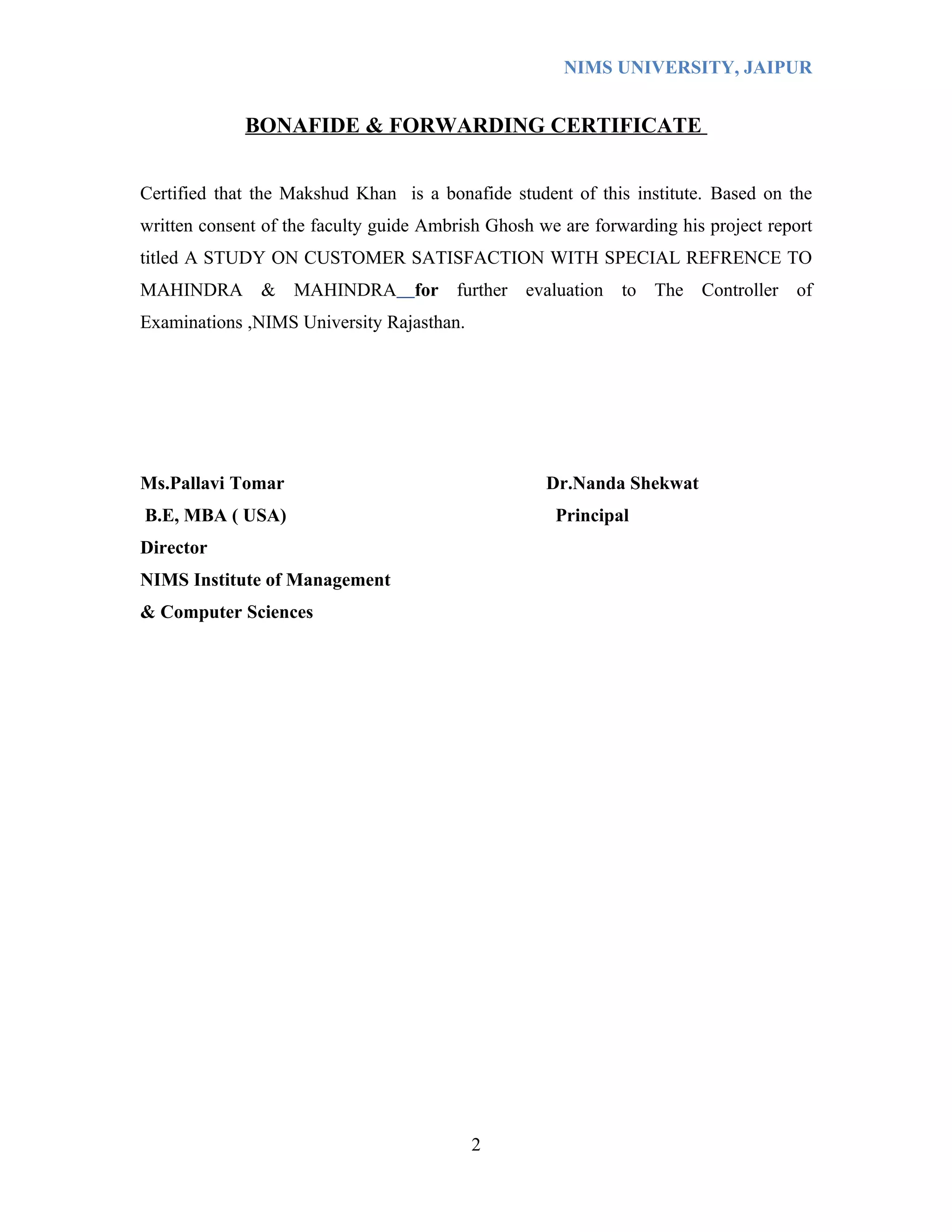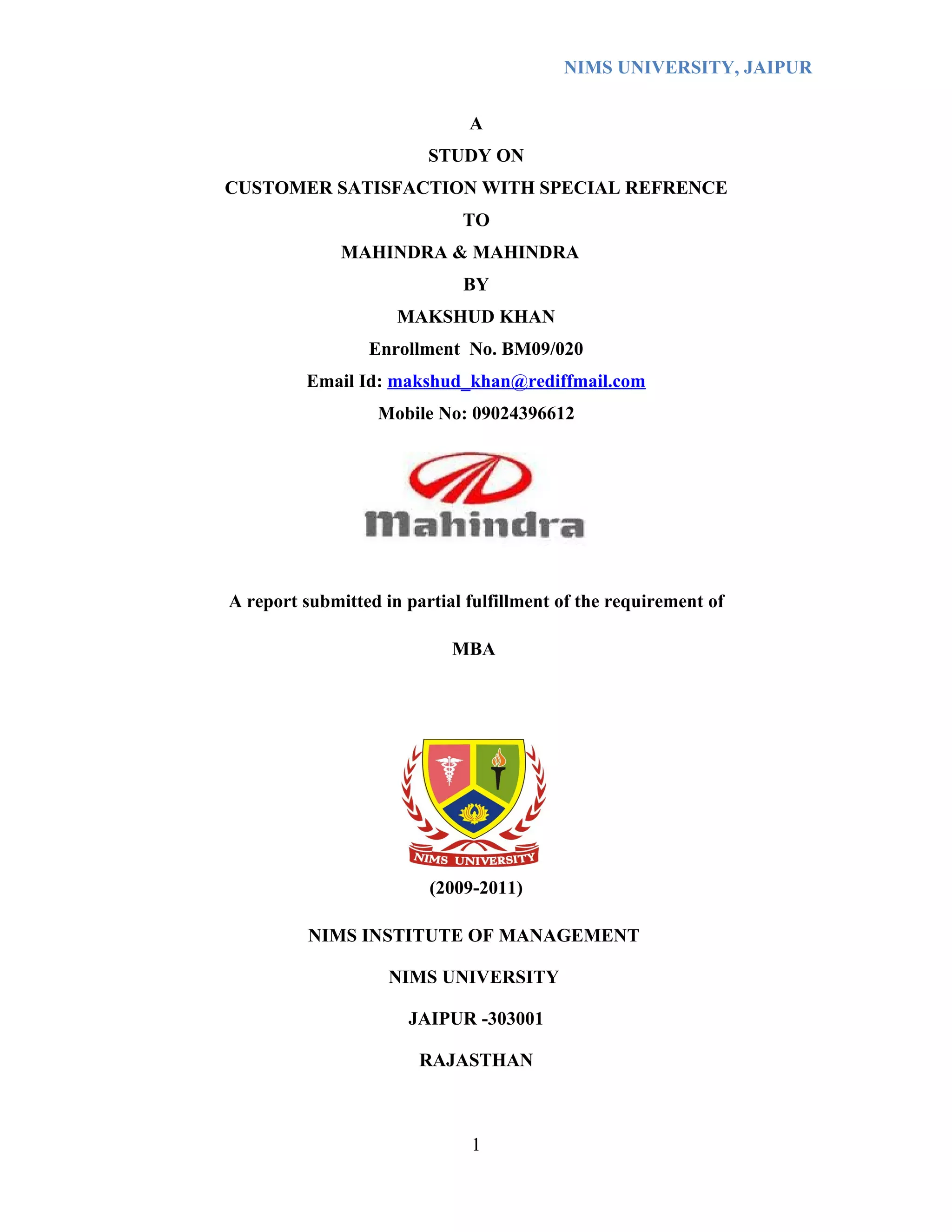 The document discusses customer satisfaction with Mahindra and Mahindra vehicles based on a study conducted in Deoghar, Jharkhand. It provides details about Mahindra's product portfolio and strategies to improve customer satisfaction. The research methodology involved collecting primary data through 150 questionnaires and secondary data from websites and magazines. Key findings were that Mahindra has a good market share in Deoghar for SUVs and customers are generally satisfied with the design, services, and facilities provided compared to other brands. The conclusion is that Mahindra is offering good customer satisfaction in Deoghar.