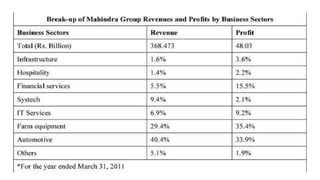 The document summarizes Mahindra's process of developing a new vision, core purpose, and positioning statement to connect with global stakeholders as the company expanded internationally. It describes how Mahindra launched a new tagline, "Rise", in 2011 along with changes to articulate the new core purpose. The challenges were embedding the new purpose across diverse business units. Mahindra defined a new core ideology and values, implemented the changes through human resources and marketing, and saw revenue growth after launching the new vision.