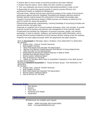 Mahmoud Mostafa Ali is seeking a job in accounting where he can utilize his education and skills, including a Bachelor's degree in Accounting, CMA certification, and over 5 years of experience in financial analysis and accounting roles at various companies. He has strong English language and computer skills and is currently working as a Financial Analyst/Senior Accountant at Mitsubishi Kuwait where his responsibilities include financial reporting, analysis, and special projects.