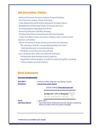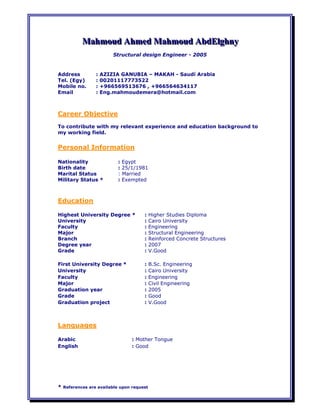 This document provides a summary of an individual's qualifications and experience as a structural engineer. It includes education credentials in civil and structural engineering, as well as over 15 years of experience in areas such as reinforced concrete design, steel structures, rehabilitation of defective structures, and project management. Responsibilities have involved layout, design, analysis, review, coordination, and field inspection of residential, industrial, and underground projects. Relevant computer skills and personal qualifications are also listed.