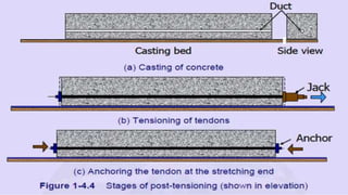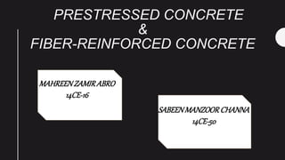 Prestressed concrete and fiber-reinforced concrete are methods to overcome concrete's weakness in tension. Prestressed concrete introduces tension into the concrete before hardening using steel wires stretched between anchors. This tension is then transferred to the concrete through bonding. Fiber-reinforced concrete uses fibers, such as steel, polypropylene or glass, to control cracking from shrinkage and drying. While fibers do not increase flexural strength, prestressed concrete allows for longer beam and floor spans than ordinary reinforced concrete.