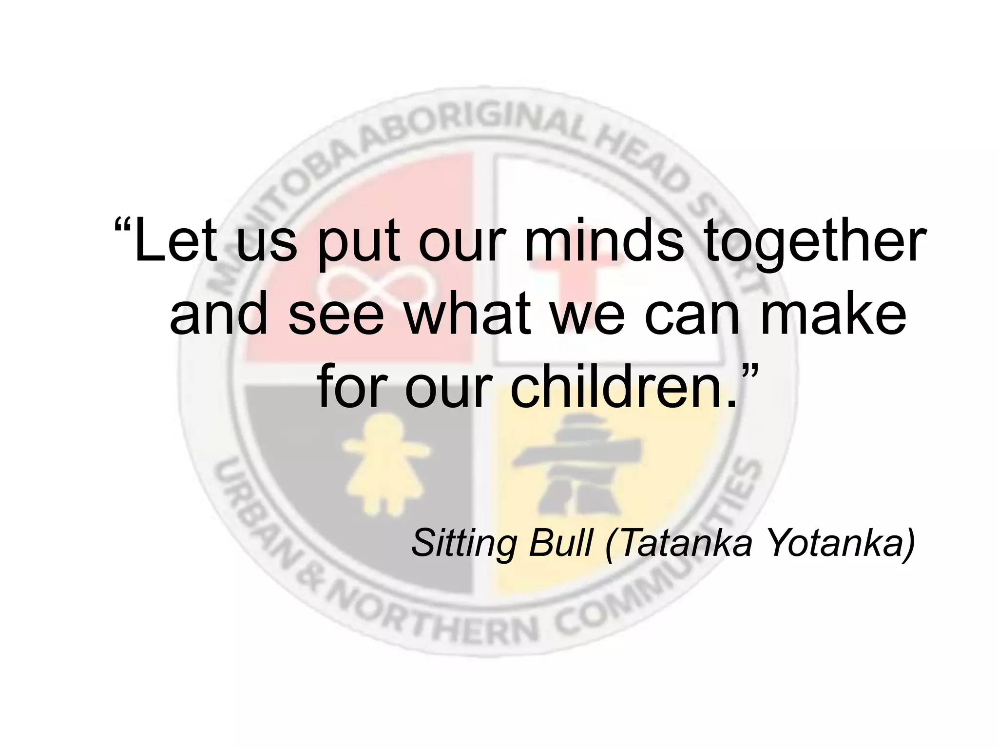 The document summarizes the Aboriginal Head Start program in Manitoba, which aims to support Aboriginal children's development and prepare them for school. The program focuses on culture, education, health, nutrition, social support, and parental involvement. An evaluation found that children developed stronger skills and parents gained knowledge to support their children's growth. The program has benefited from dedicated staff and the support of funders and sponsors over its 15-year history.