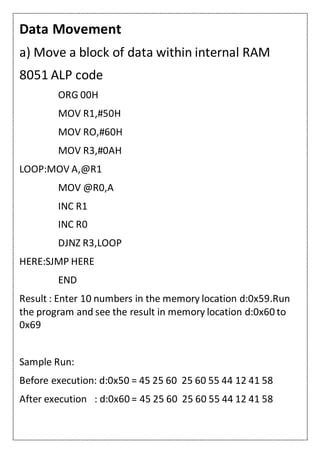 This document contains code snippets and explanations for basic experiments using 8051 assembly language code. It includes examples of: