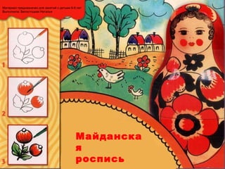 Документ посвящен майданской росписи, традиционному искусству Нижегородского края, aimed at introducing children aged 6-9 to its history and elements. Он описывает процесс изготовления деревянных игрушек и посуды, а также особенности росписи, которая используется в детских образовательных учреждениях. Методика обучения включает освоение простейших элементов, таких как листья, ягоды и цветы, с целью развития детской фантазии.