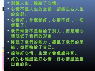 心情好,什麼都好,心情不好,一切 都亂了。 我們常常不是輸給了別人,而是壞心 情貶低了我們的形象, 降低了我們的能力,擾亂了我們的思 維,從而輸給了自己。 控制好心情,生活才會處處祥和。 好的心態塑造好心情,好心情塑造最 出色的你。