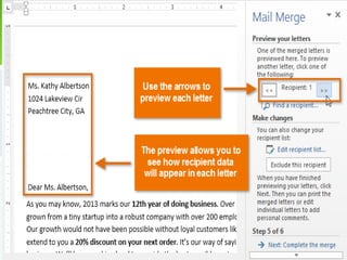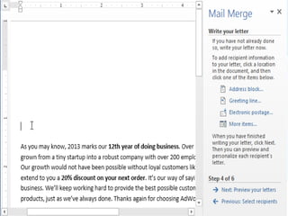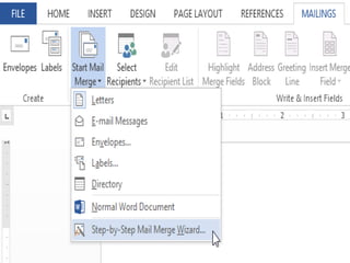 This document discusses mail merge, a tool that allows producing multiple customized documents from a main document and a data source. It introduces the two components of a mail merge: the form document and the data file. It then outlines the six steps to performing a mail merge using Microsoft Word: 1) choosing the document type, 2) selecting the form document, 3) selecting recipients from an existing list or typing a new one, 4) writing the document and adding placeholders for recipient data, 5) previewing the merged documents, and 6) printing the final documents.