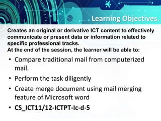 The document discusses using mail merge in Microsoft Word to send personalized letters or documents to multiple recipients. It explains that mail merge requires a form document, which contains placeholder fields, and a data file that contains contact information for each recipient. The data file is linked to the form document and Word automatically populates the fields for each contact, allowing an individualized document to be created for each person. Step-by-step instructions are provided for setting up the form document, creating a recipient list in the data file, and running the mail merge to generate individual documents.