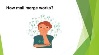 A mail merge combines a main document with data from a separate data source to create personalized documents. The main document contains text that is the same for all documents, while fields are inserted that will be populated from the data source. A data source is typically a spreadsheet, database, or table containing records with fields like names and addresses. To perform a mail merge, a main document is created, fields are inserted, the data source is selected, and the merge is previewed and completed to output individual documents.