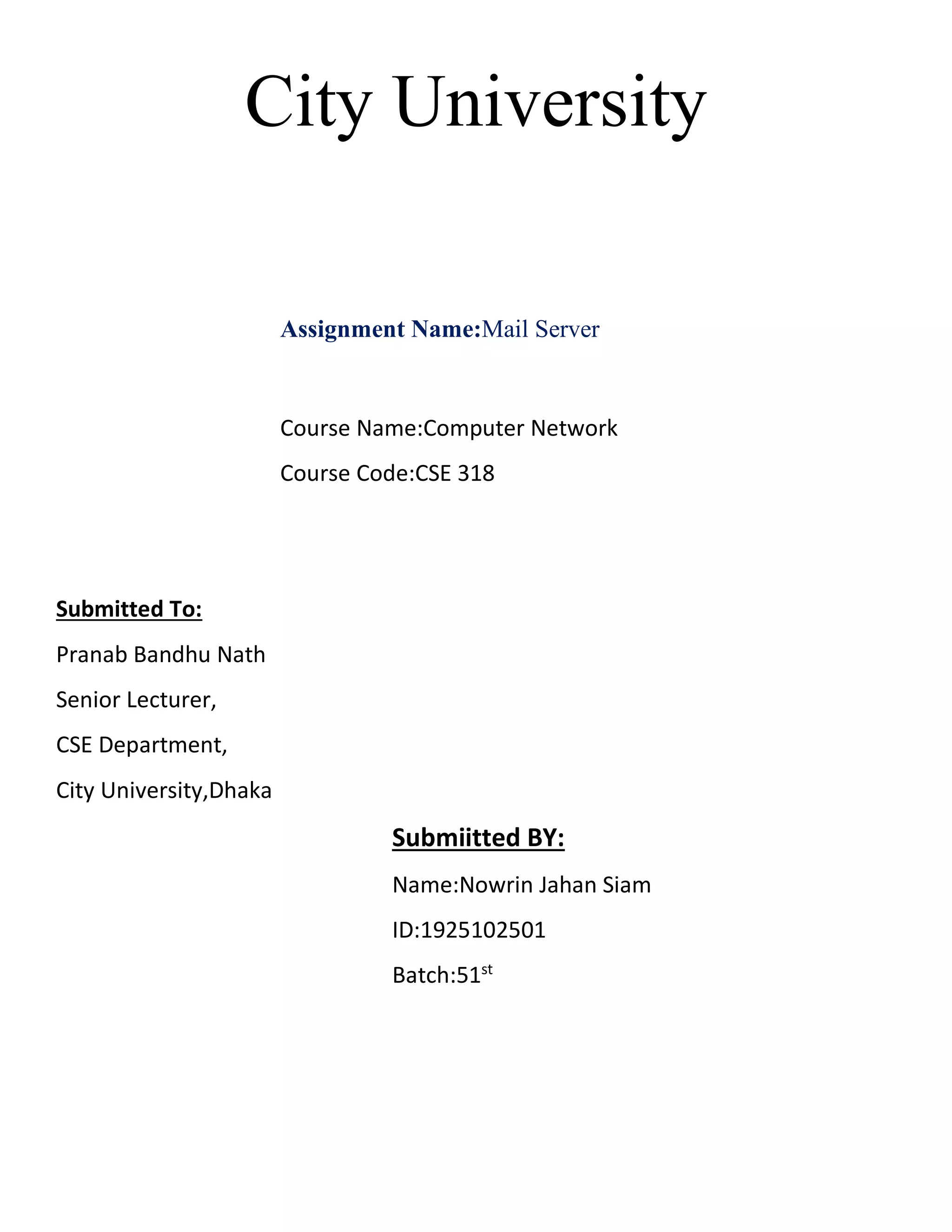 This document is a student assignment for a computer networks course submitted to their lecturer. It involves configuring a mail server in Packet Tracer with IP addresses assigned to 4 PCs and the mail server. The objective is to configure the mail server for the assignment.