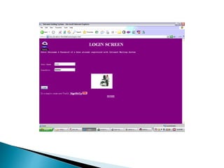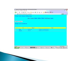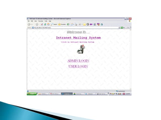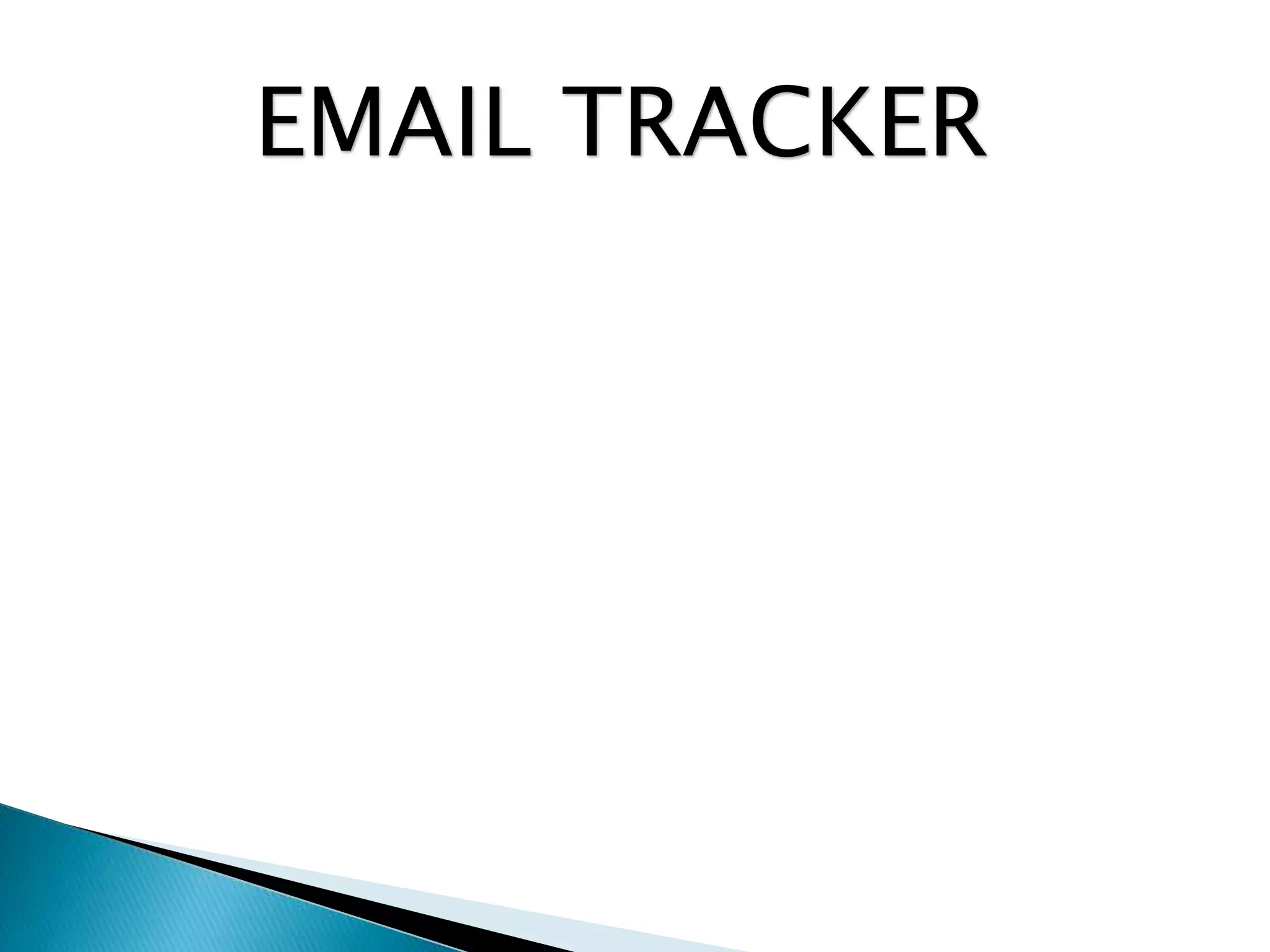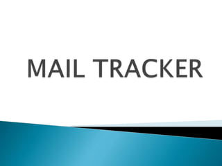This document outlines an email tracker project that monitors users' email transactions. It proposes tracking users' sent and received emails to restrict unauthorized email use within an organization. The system would include modules for admins to view user transactions and for users to access their inbox, outbox, send, receive and delete emails. It specifies hardware, software and UML diagram requirements and provides screen shots and conclusions about the project's tracking features and potential for expansion.