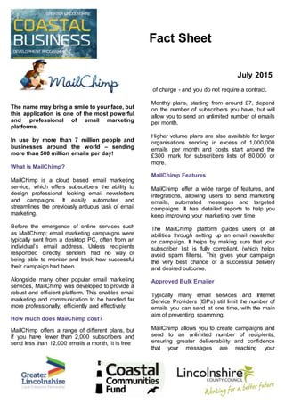 MailChimp is a cloud-based email marketing service that allows users to design professional email newsletters and campaigns. It offers both free and paid plans, with the free plan allowing up to 2,000 subscribers and 12,000 emails per month. MailChimp provides tools to create and send campaigns, track opens and clicks, and view detailed reports on campaign performance. It also ensures emails are complaint with privacy laws and are recognized as safe by email providers to maximize deliverability.