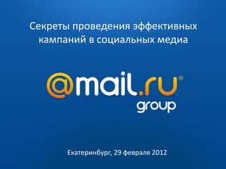 Документ описывает секреты проведения эффективных рекламных кампаний в социальных сетях, включая таргетинг и оплату за показы или переходы. Указывается на важность охвата аудитории и адаптации рекламы к ожиданиям пользователей, а также различные форматы объявлений и способ их размещения. Приводятся примеры успешных кампаний и рекомендации по оптимизации рекламы для повышения эффективности.