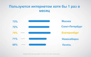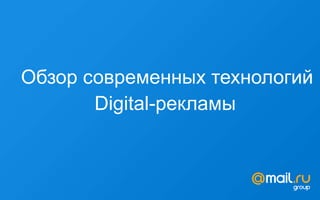 Документ представляет обзор цифровой рекламы в России, включая данные о количестве интернет-пользователей и их активности на различных платформах. Основные игроки рынка включают mail.ru group, Яндекс и Google, а также рассматриваются эффективные метрики для оценки рекламных кампаний. Отмечен рост видео-рекламы и влияние мобильного интернета на рекламу, с акцентом на конверсии и эффективность различных типов рекламы.