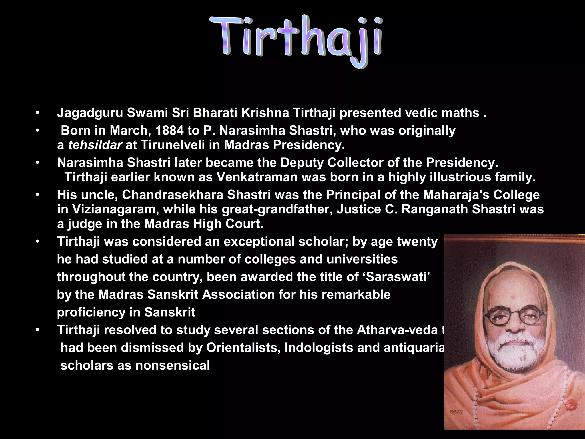 This document discusses the history and development of Vedic mathematics by Jagadguru Swami Sri Bharati Krishna Tirthaji. It explains that Tirthaji rediscovered a system of unique mental calculation techniques from the Vedic texts between 1911-1918. This system, called Vedic mathematics, is based on 16 sutras or formulae that can be used to solve any type of mathematical problem quickly in the head. The techniques were popularized in the late 1960s when a book on the system reached London, renewing global interest in Vedic math.