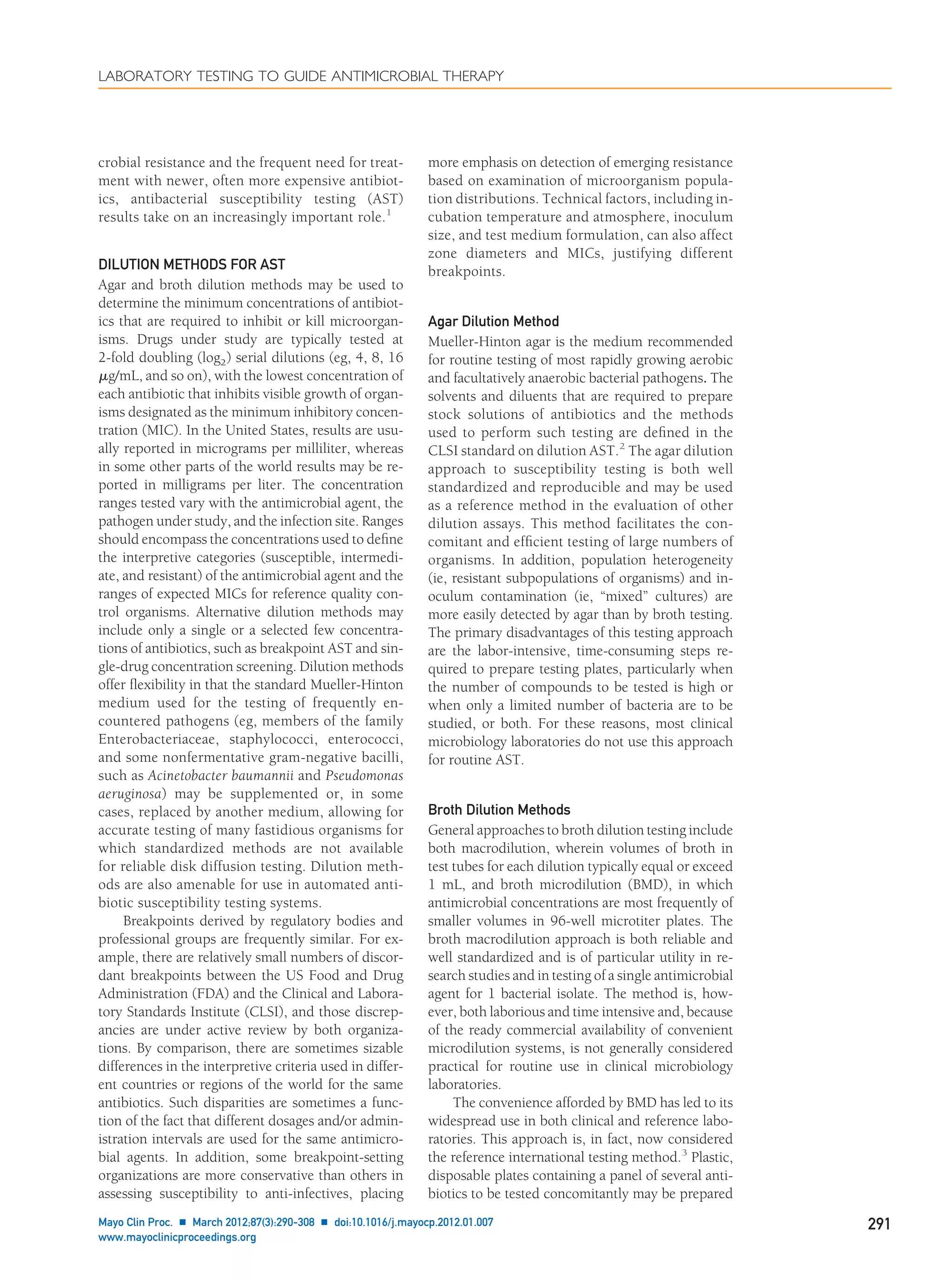 - Several laboratory methods are available for AST, including agar and broth dilution methods which test serial dilutions of antibiotics to determine the MIC. Breakpoint values define antibiotic concentrations as susceptible, intermediate, or resistant.