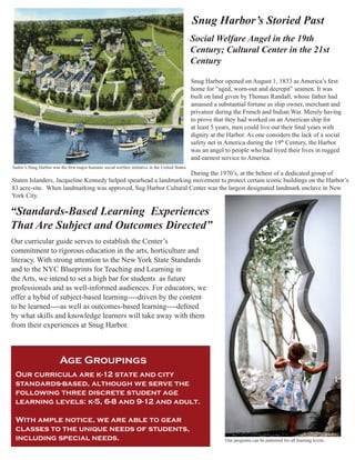 This document provides a curricular guide for Snug Harbor Cultural Center and Botanical Garden. It outlines the educational programs and resources available in various arts including theatre, visual arts, architecture, horticulture, and language/literacy. The guide describes courses focused on performance, art history, design, botany, gardening, and creative writing. Venues like art galleries, gardens, and historic buildings provide spaces for both appreciating and creating art. The goal is to set high standards for student learning in the arts and cultural subjects.