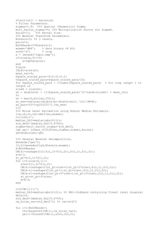 This document contains code for denoising an image using wavelet thresholding. It performs the following steps: