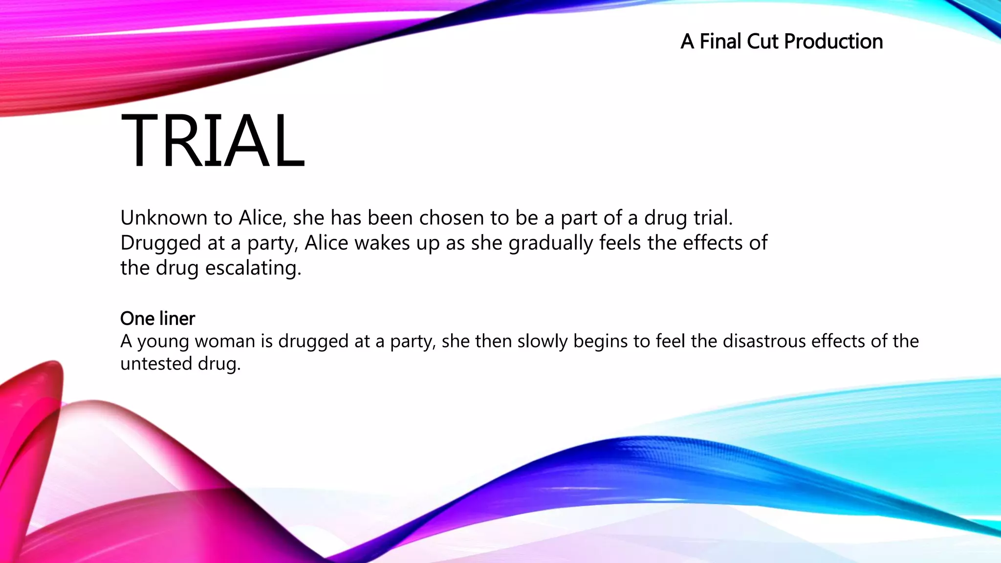 A young woman named Alice attends a party where she is unknowingly drugged. She wakes up feeling the effects of the untested drug escalating in a dark room, unsure of where she is or how she got there. Flashbacks reveal she was last at a nightclub before losing consciousness. The film will explore Alice's deteriorating mental and physical state under the influence of the mysterious drug.