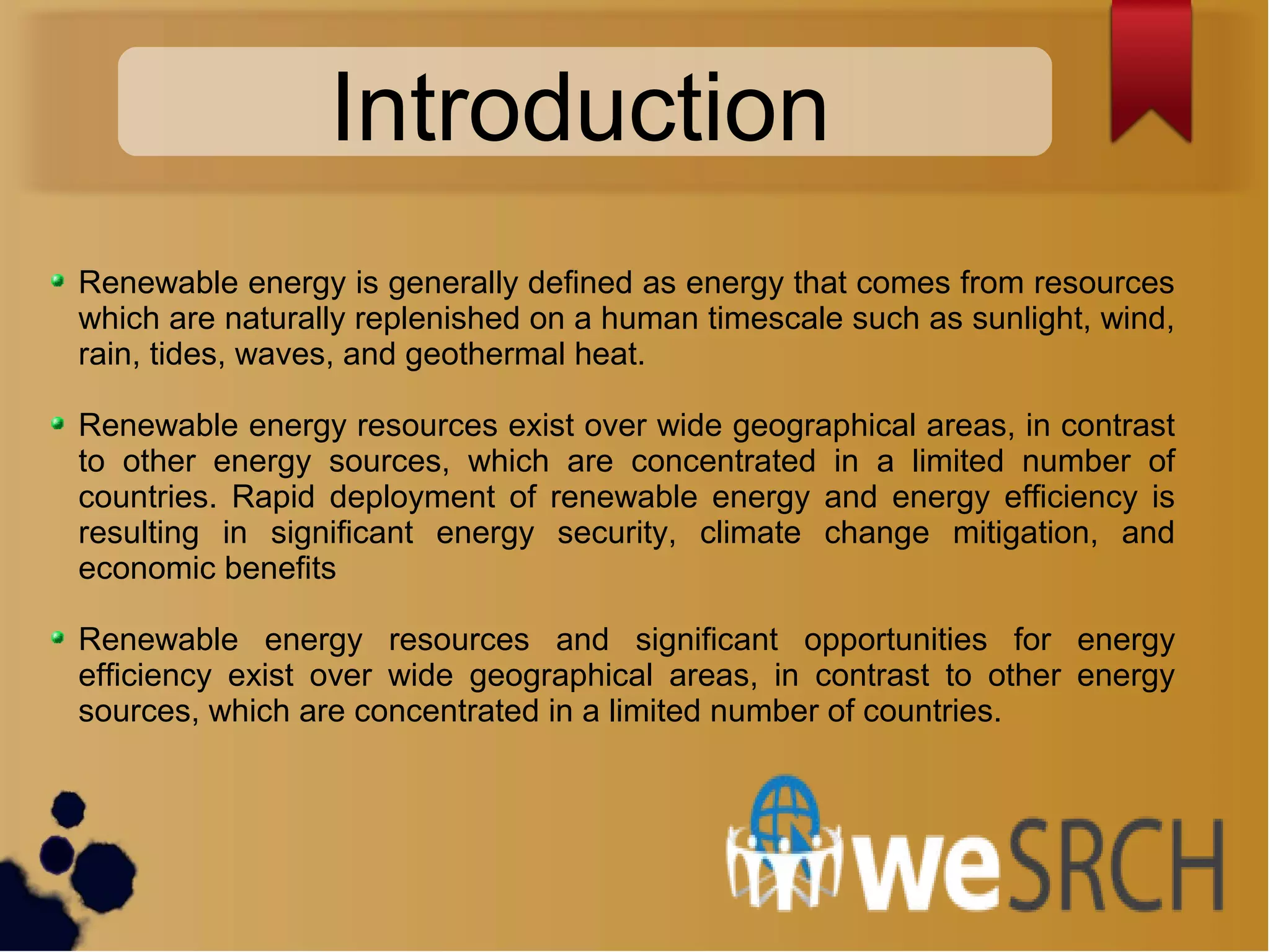 Renewable energy encompasses resources like sunlight, wind, rain, and geothermal heat, which are naturally replenished and widely distributed. Key types include wind energy, hydro energy, solar energy, biomass energy, and geothermal energy, each offering significant benefits for energy security and climate change mitigation. As renewable resources can be harnessed using various technologies, they are increasingly recognized for their potential to meet global energy demands sustainably.