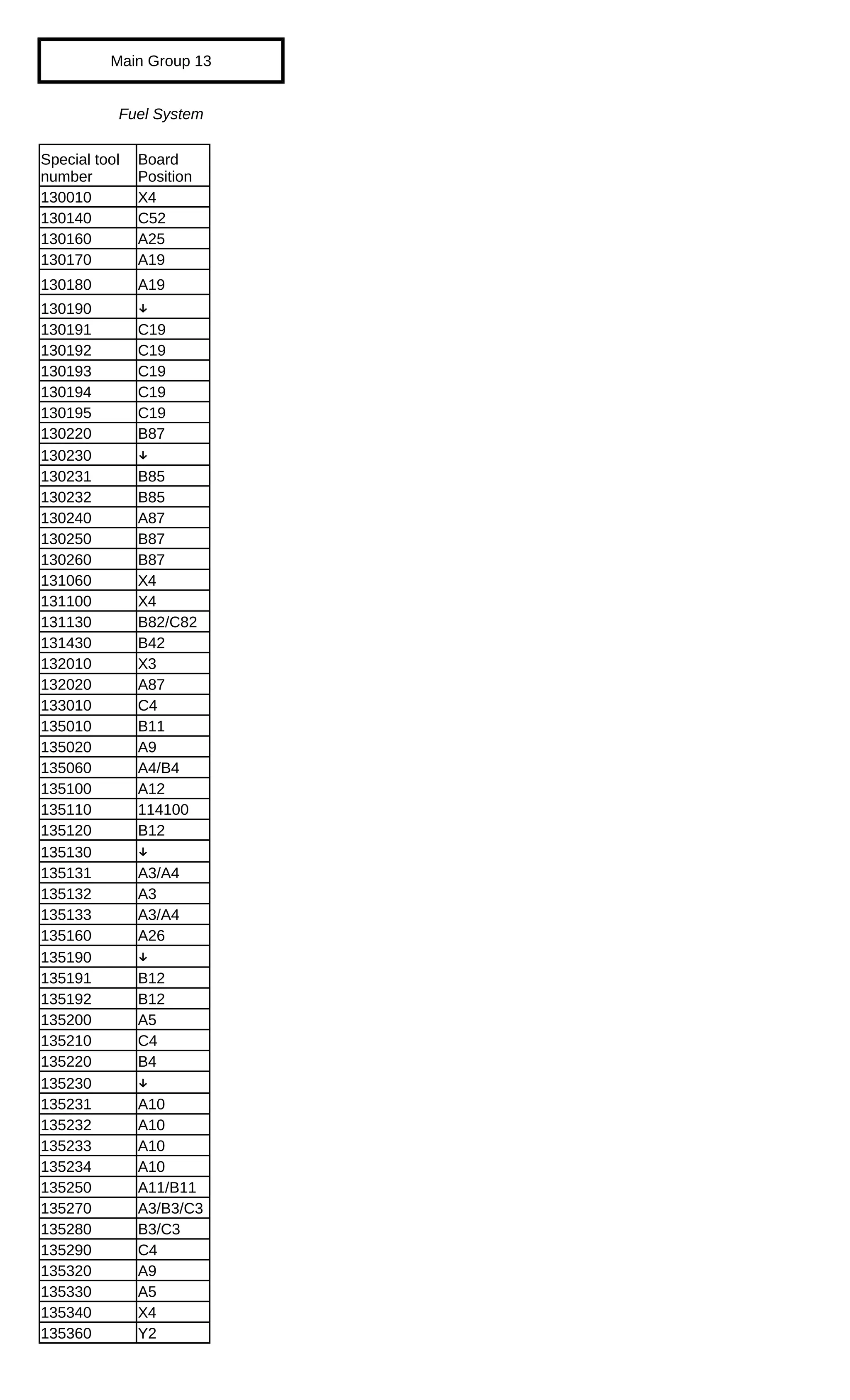 This document contains a list of special tool numbers used for fuel system maintenance, along with their corresponding board position. There are over 135 special tool numbers listed with positions ranging from locations like X4, A19, and B85. The tools are used to work on components like fuel pumps, injectors, and other fuel system parts.