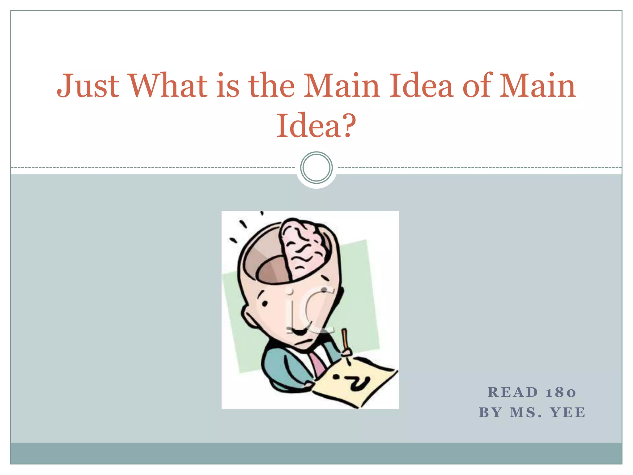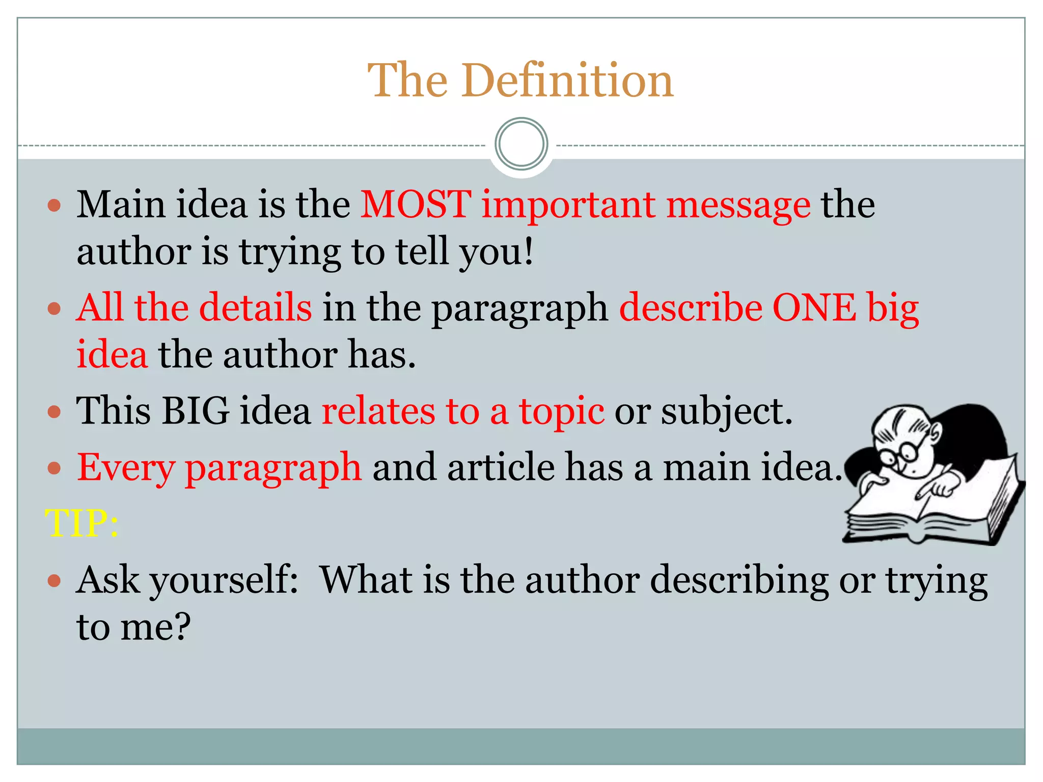 The document provides guidance on identifying the main idea in texts. It defines main idea as the most important message the author aims to convey through supporting details. Readers can look for clues like titles, repeated words, and first/last sentences to determine the stated main idea. When the main idea is not directly stated, readers must analyze details to infer the implied main idea. The document demonstrates this process and encourages practicing identifying stated and implied main ideas with a partner.