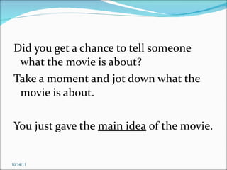 The document provides tips for determining the main idea and theme of reading passages. It advises the reader to state the main idea in their own words after reading and choose answer choices that match their main idea statement. Readers should avoid picking detail-oriented answer choices or confusing details for the main idea. Questions about the title of a passage often relate to the main idea. To identify the theme, readers should consider the lesson or message intended by the author.