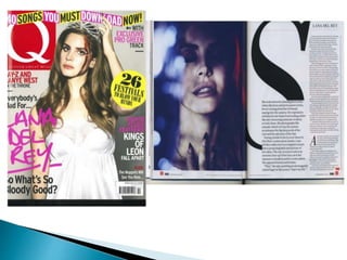 The document analyzes and compares the visual elements and composition of the front cover and a double page article spread that feature the model Lana del Rey. For the front cover, the image is a medium shot from the head to torso with a plain background, light makeup suggesting innocence, and bright lighting. The props imply she is a wounded princess. In the article spread, the close-up image has some out-of-focus scenery, darker makeup giving a dramatic look, darker lighting, and her body language suggests deep thought. The article layout has information on the right side in three paragraphs with drop capitals and equal columns.