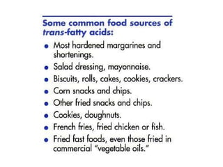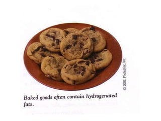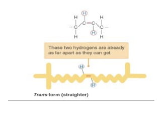 2. It explains the structures and properties of saturated and unsaturated fatty acids. Triglycerides are formed from glycerol and three fatty acids and are a major form of fat storage.