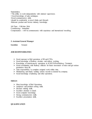 The document outlines urgent job openings in various manufacturing industries across India, including positions for a telecaller, marketing executive, assistant general manager, HR manager, quality engineer, and several others, each with specific qualifications and experience requirements. Salary ranges vary by position, from 12-15k/month for entry-level roles to 20-22 lakh/annum for senior positions. The document provides detailed job descriptions and locations for each role, seeking immediate candidates.