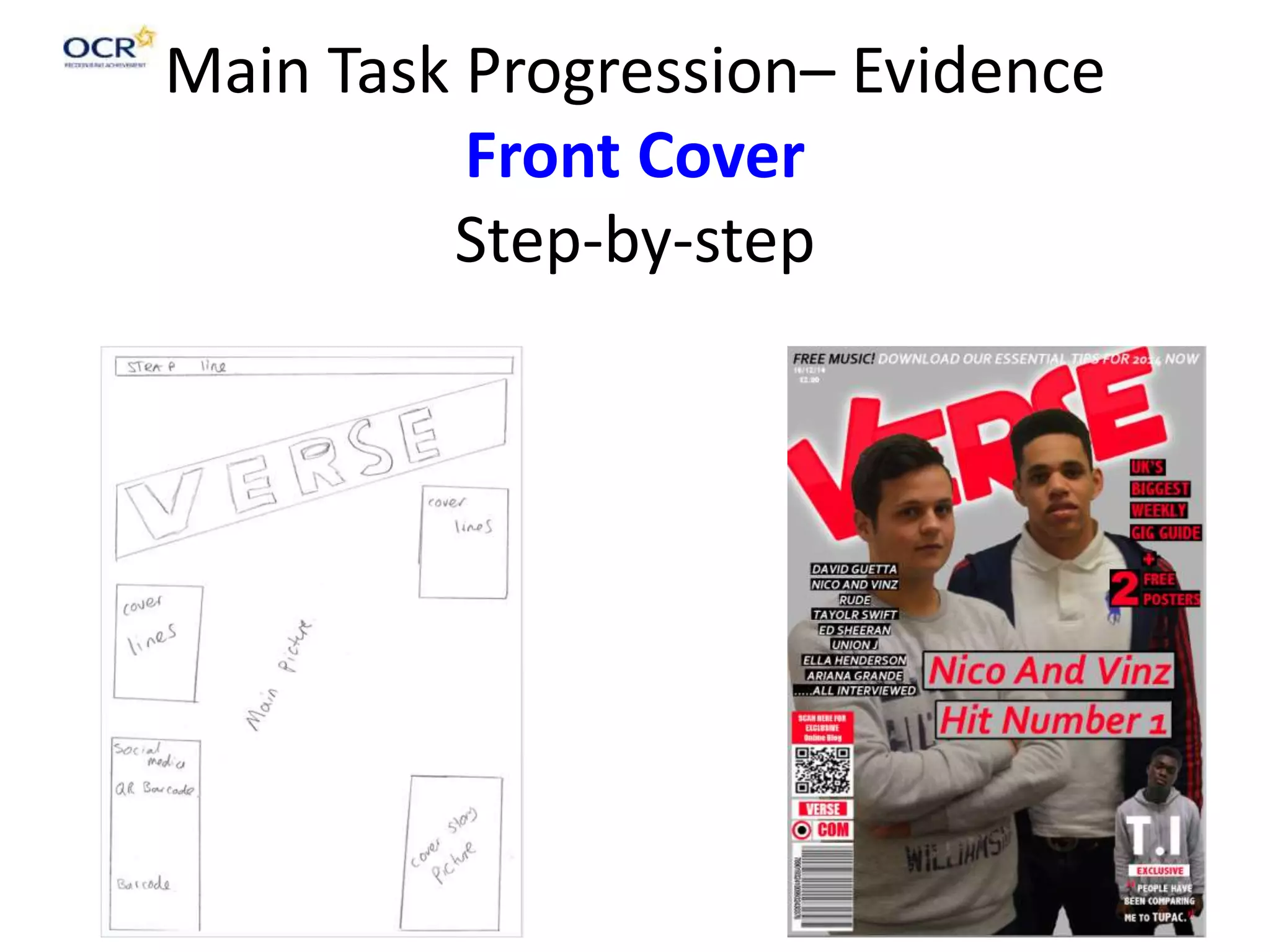 The document describes the process of creating the front cover, contents page, and a double page spread for a music magazine. For the front cover, the creator added a cover line story and picture, social media links, and a QR barcode. Feedback was incorporated to improve the professionalism. For the contents page, the creator experimented with positioning the model and titles before adding section details. Feedback prompted changes to sizes. For the double page spread, the creator focused the close-up picture and added a logo, interviewee names, and text from the interview evenly across the pages in different colors. The final versions link the images and text cohesively.