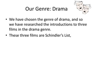 The document is an analysis of film techniques in the drama genre, focusing on 'Schindler's List' and 'Saving Private Ryan,' exploring aspects such as mise-en-scène, editing, sound, and narrative codes. It highlights how visual elements, editing styles, and audio choices contribute to the emotional impact and storytelling of a film. Additionally, it offers insights on utilizing suspense and cultural codes in filmmaking, while providing guidance for creating a modern film opening with similar techniques.