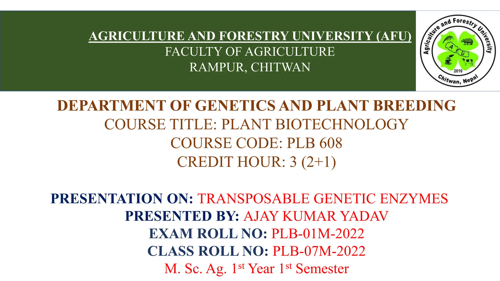 The document presents a comprehensive overview of plant biotechnology, focusing on transposable genetic elements (transposons) and their significance in plant genetics, including definitions, types, and mechanisms of transposition. It highlights Barbara McClintock's pioneering work and discoveries related to transposons, emphasizing their role in genetic mutations, gene regulation, and applications in genetic engineering. Additionally, the document outlines the biological significance and various uses of transposable elements in plant genetic research and agriculture.