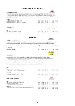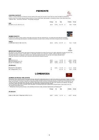 This document provides information on several Italian wine producers and their offerings, including brief descriptions of the wineries, wine styles and available vintages. It highlights wines such as Barbera d'Asti Vespa DOC 2012 from Piemonte, Gavi di Gavi La Merlina DOCG 2012 from Gemme Fausto, and Franciacorta Gran Cuvée Brut DOCG 2007 from Bellavista in Lombardia.