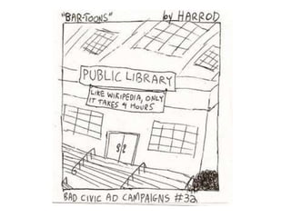 - The document discusses challenges facing libraries in a changing digital landscape and opportunities for libraries to encourage innovation.