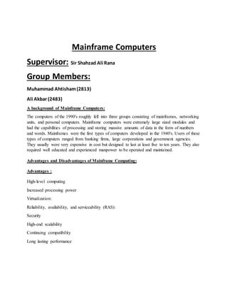 Mainframe computers were the first type of computers developed in the 1940s. They were extremely large with the ability to process and store massive amounts of data. Mainframes were used by banks, large corporations, and government agencies due to their high-level computing power, increased processing power, reliability, availability, scalability, and security. While expensive initially, mainframes were designed to last 5-10 years with low ongoing costs. Modern mainframes continue to offer significant advantages over cloud computing including high-end performance, security, reliability, and customization.