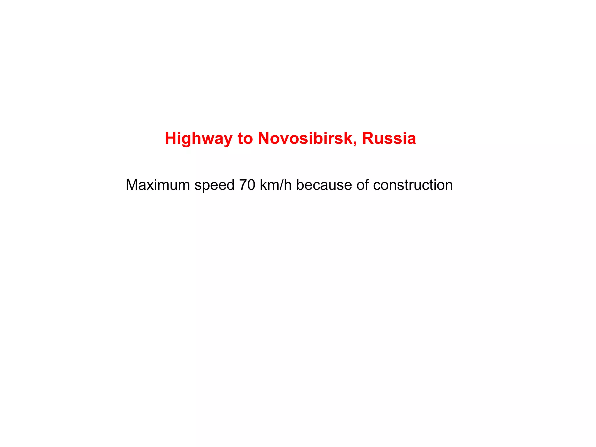 The document discusses a highway to Novosibirsk, Russia. Due to ongoing construction, the maximum speed allowed on this highway is 70 km/h. Construction is currently limiting speeds to 70 km/h on the highway to Novosibirsk.