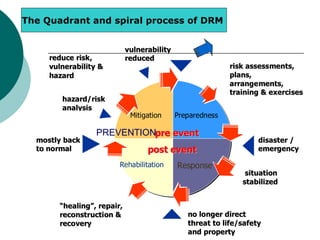 The document discusses mainstreaming disaster risk management (DRM) into development work. It outlines steps to mainstream DRM institutionally, such as raising awareness and developing tools and methodologies. It also discusses the Hyogo Framework for Action's five priority areas: governance, risk assessment, knowledge and education, risk management, and preparedness and response. Finally, it presents workshops and an action plan for mainstreaming DRM at the community, program unit, and country office levels.