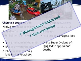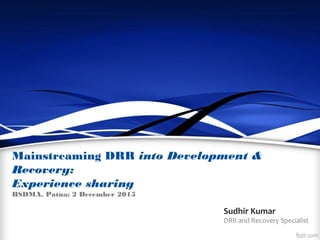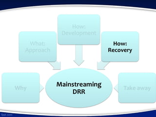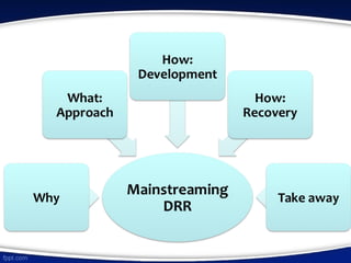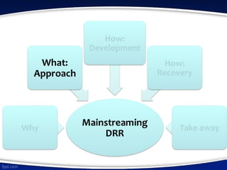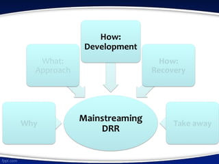 The document discusses the integration of disaster risk reduction (DRR) into development and recovery strategies, highlighting case studies from regions such as Nepal and Gujarat. It emphasizes the importance of a systematic approach to include DRR and climate change adaptation (CCA) in development planning at various levels. Key successes in mainstreaming DRR are noted, along with lessons learned from major disasters and recovery efforts.