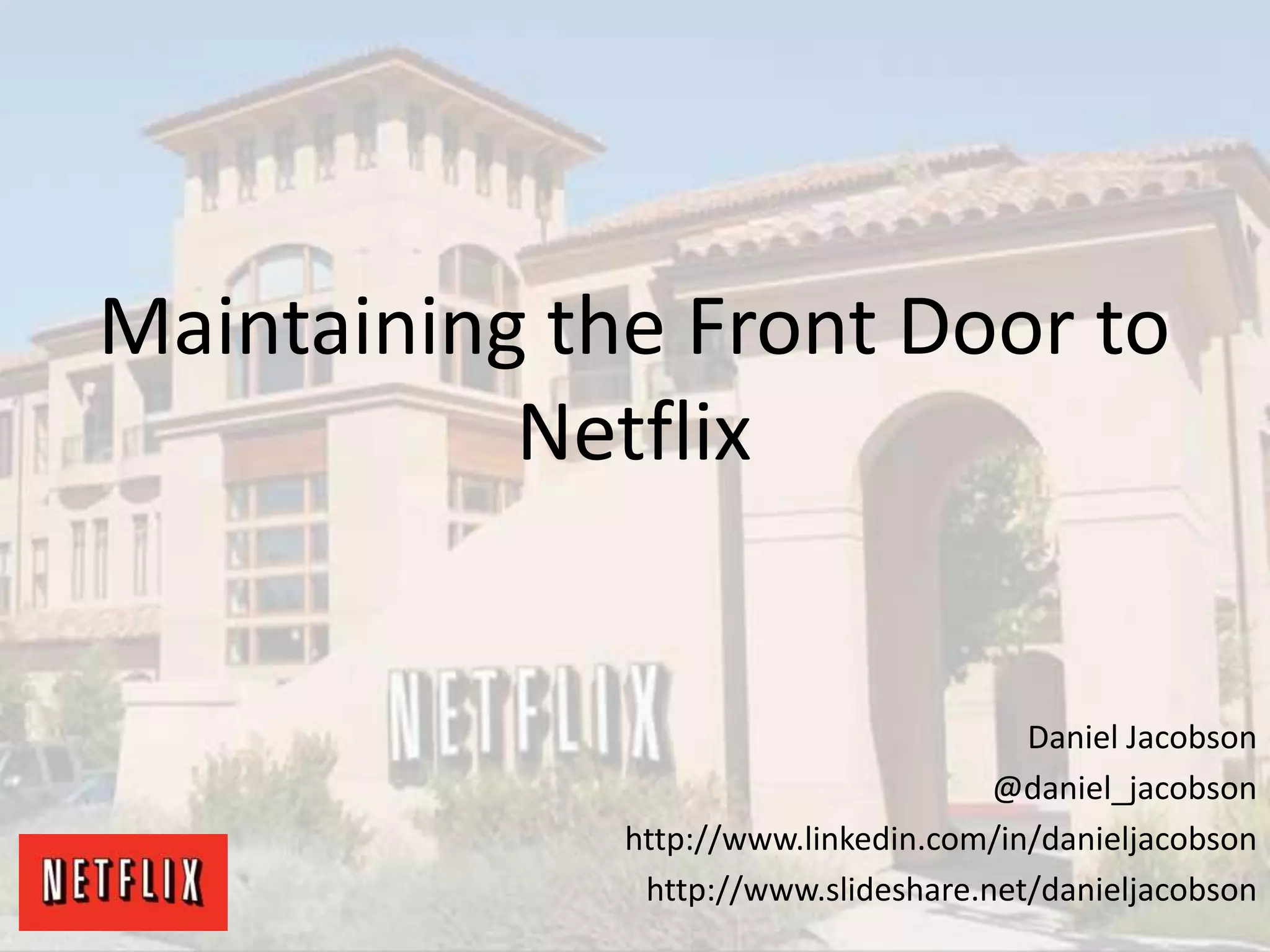 The presentation by Daniel Jacobson details the architecture and operational strategies of Netflix's global streaming service, which serves over 44 million subscribers across more than 40 countries. Key points include the challenges of maintaining a resilient API, scaling the system, and implementing predictive auto-scaling with tools like 'Scryer' and chaos testing methodologies to ensure reliability. Additionally, it emphasizes the importance of data brokering and personalized content delivery across over 1,000 device types.