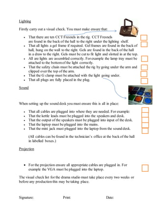 The document provides instructions for setting up lighting, sound, and projection equipment for a production. It lists requirements for ensuring the correct number and type of lights are assembled safely and cables are properly plugged in for the sound desk and projection. The visual check list outlined in the document should be completed every two weeks or before any production.