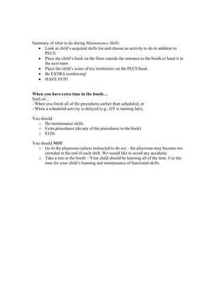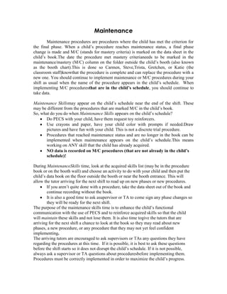 Maintenance procedures are procedures where the child has met mastery criteria for the final phase. When a procedure reaches maintenance status, it is marked as such in the child's data book and folder. During maintenance skills time on the child's schedule, tutors should look at the child's acquired skills list and choose an activity, place the data book outside the booth, and have fun reinforcing skills without taking data. The purpose is to enhance functional communication and maintain acquired skills.