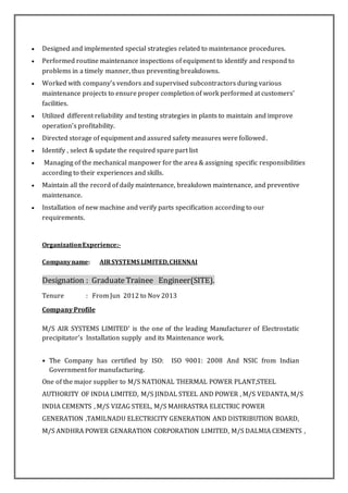 Ashok Kumar Singh is a mechanical engineer seeking a position that allows him to enhance his technical skills and contribute value. He has over 5 years of experience in maintenance engineering and project execution roles. He is proficient in maintenance procedures, equipment inspections, and managing vendors. Ashok holds a Bachelor's degree in Mechanical Engineering and has experience working for companies in the composite materials and electrostatic precipitator industries.